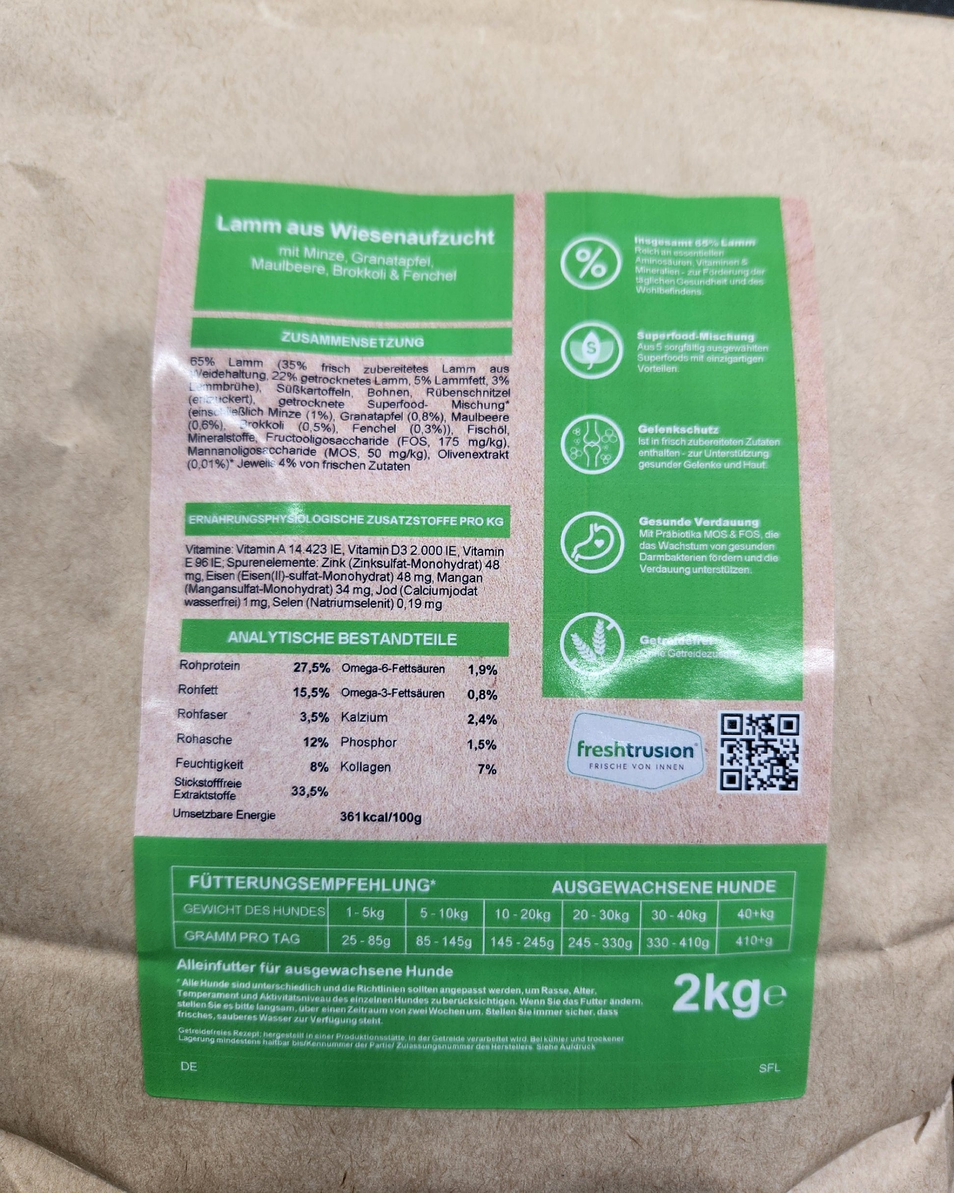 Dieses Futter kombiniert 65 % Lamm aus Wiesenhaltung, nĂ€hrstoffreiche Superfoods und eine komplett getreidefreie Rezeptur. Perfekt fĂŒr empfindliche Hunde, die hochwertige Proteine und eine besonders vertrĂ€gliche ErnĂ€hrung benötigen.